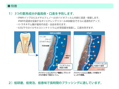 ///製品の特長///1)3つの薬用成分が歯周病・口臭を予防します。