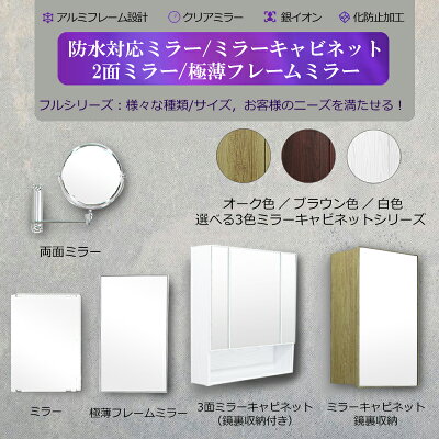 防水90x65cm白木目細フレーム一ミラー収納(三面鏡)(MQ-9061)材質:アルミとグラスミラー★